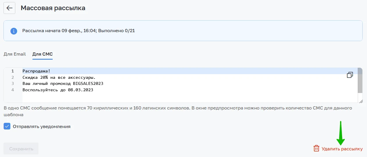 Стоимость SMS-рассылки начинается от 3,49 ₽ и зависит от тарифного плана.