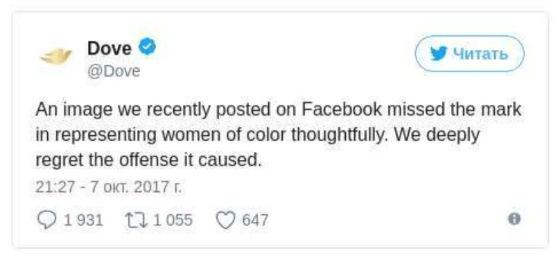 Чем дело кончилось. Внезапно для компании ролик назвали расистским, несмотря на то, что девушка «переодевается» дважды. Ролик удалили и извинилась перед пользователями в официальном аккаунте Twitter. Они заявили, что никого не хотели задеть или обидеть. «Отмываться» пришлось долго — пользователи не приняли извинения и подчеркнули, что образ транслирует идею нечистоплотности темнокожих.