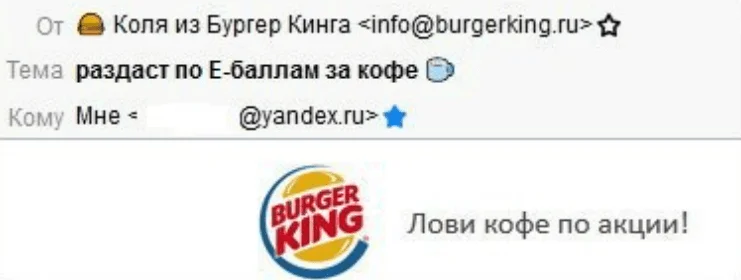 В чём суть. В 2018 году подписчикам рассылки Burger King поступило сообщение с предложением «получить по Е-баллам за кофе».
