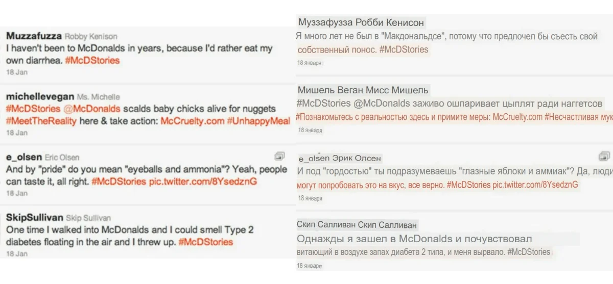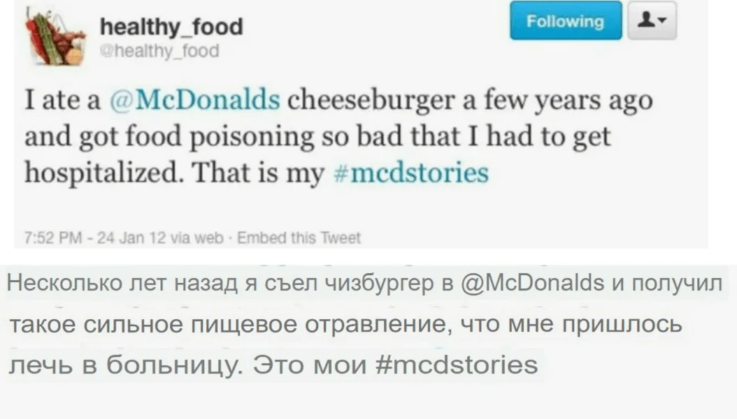 В чём суть. Компания McDonald's запустила хештег для Твиттера #McDStories. Они планировали, что под этим хештегом будут рассказывать позитивные истории о посещениях предприятия питания и делиться положительными эмоциями.