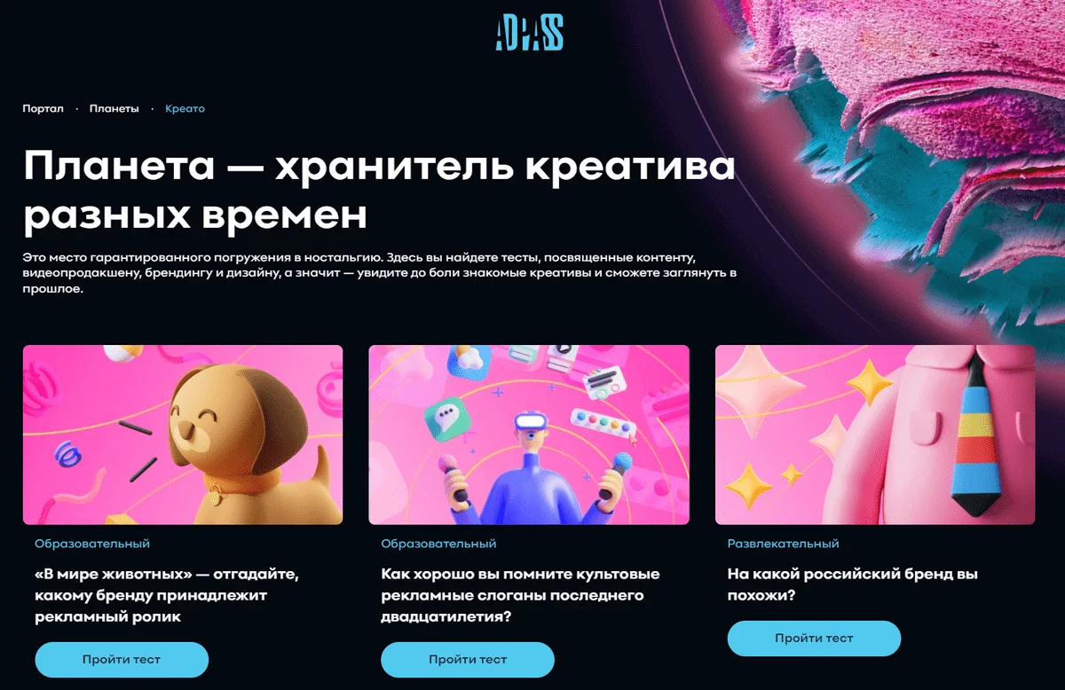 Что за проект. Блог-платформа ADPASS запустила спецпроект в космическом стиле. Проект интерактивный: каждый желающий может проверить себя на знание истории маркетинга и рекламы, вспомнить теорию и практику, испытать свою эрудицию.