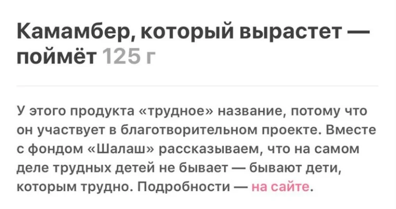 Что понравилось. Авторы спецпроекта уверены: трудных детей не бывает — бывают дети, которым трудно. Именно поэтому новые названия продуктов получились душевными и заботливыми. В них наверняка каждый узнал бы себя в юности: вот зефир, который витает в облаках, а вот пластовой творог, который лежит без дела.