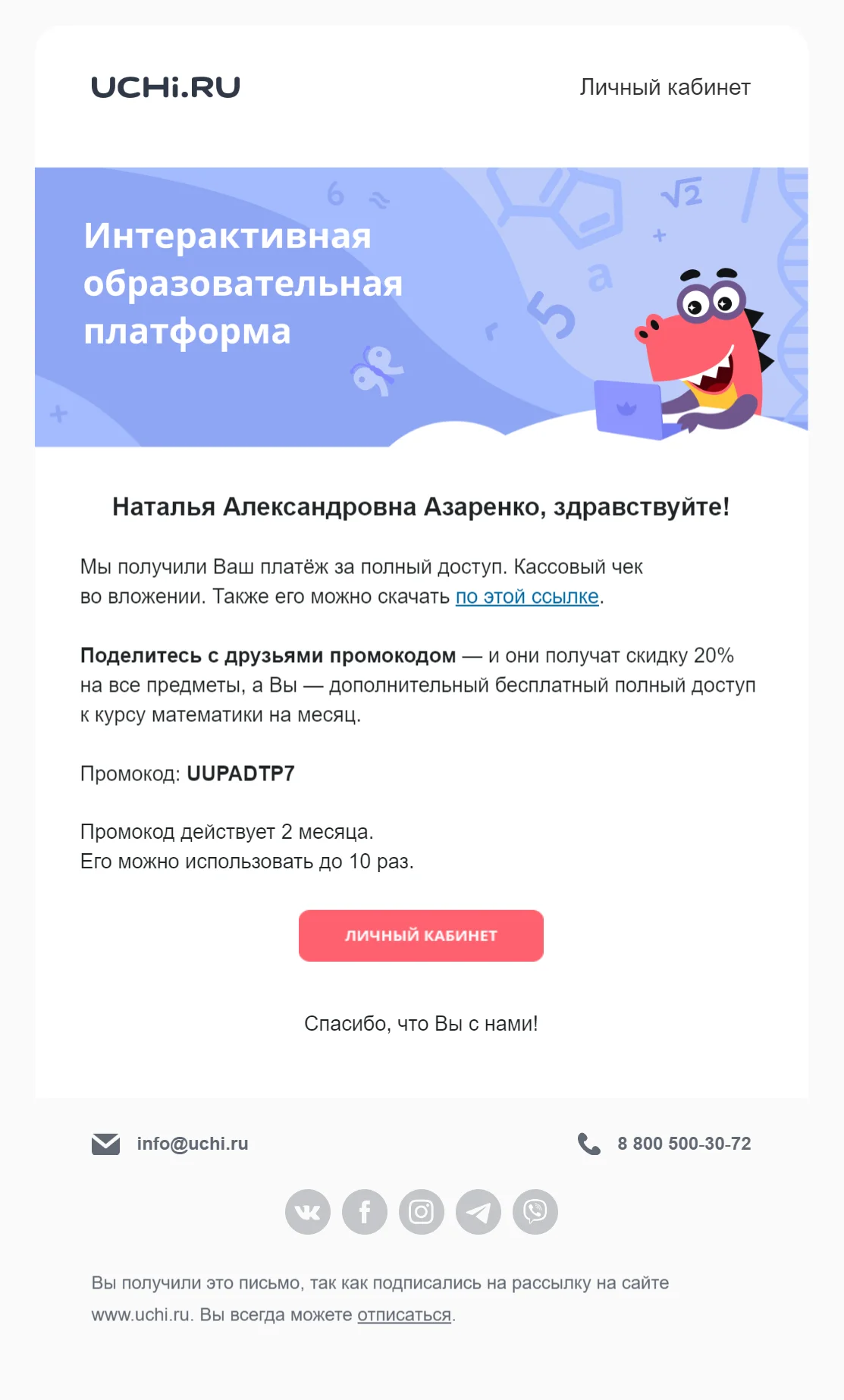 Увеличивают лояльность аудитории. Поскольку сообщения связаны с действиями конкретного пользователя, они максимально персонализированы (имя, личные характеристики, совершённые действия). Это подчёркивает индивидуальный подход.