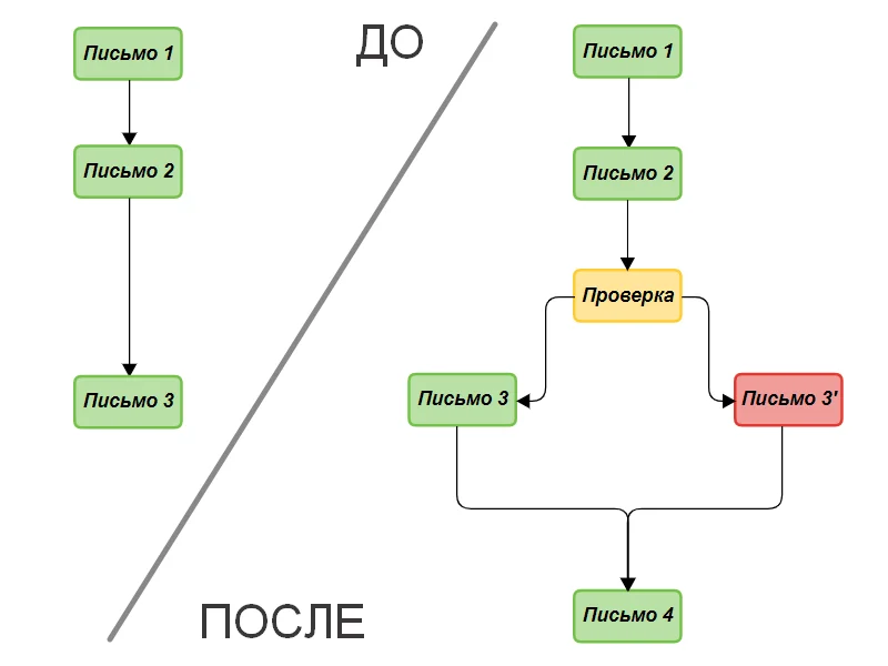 Иногда — и так случается чаще всего — запущенная цепочка триггерных сообщений не приносит сразу запланированный результат. После измерения её показателей, письма приходится пошагово улучшать, вносить изменения, пробуя разные варианты и гипотезы, а затем вновь измерять, что получилось.