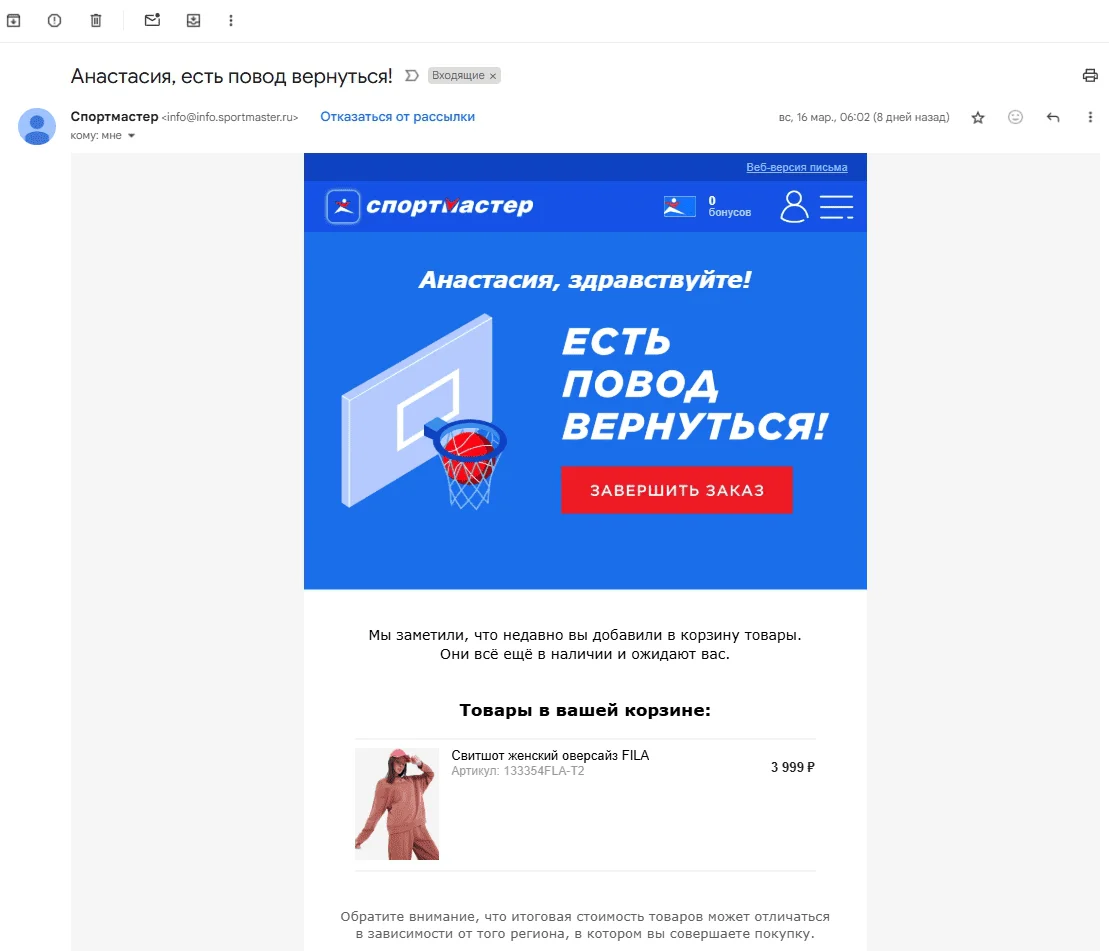 Письма-напоминания о незавершённых действиях. Отправляются в случае, если пользователь начал выполнять на сайте какое-то целевое действие — оформлять заказ, заявку на услугу, регистрацию на мероприятие — но не завершил его. Задача таких писем — привести пользователя к завершению действия. Характерный пример — напоминание о брошенной корзине в интернет-магазинах.