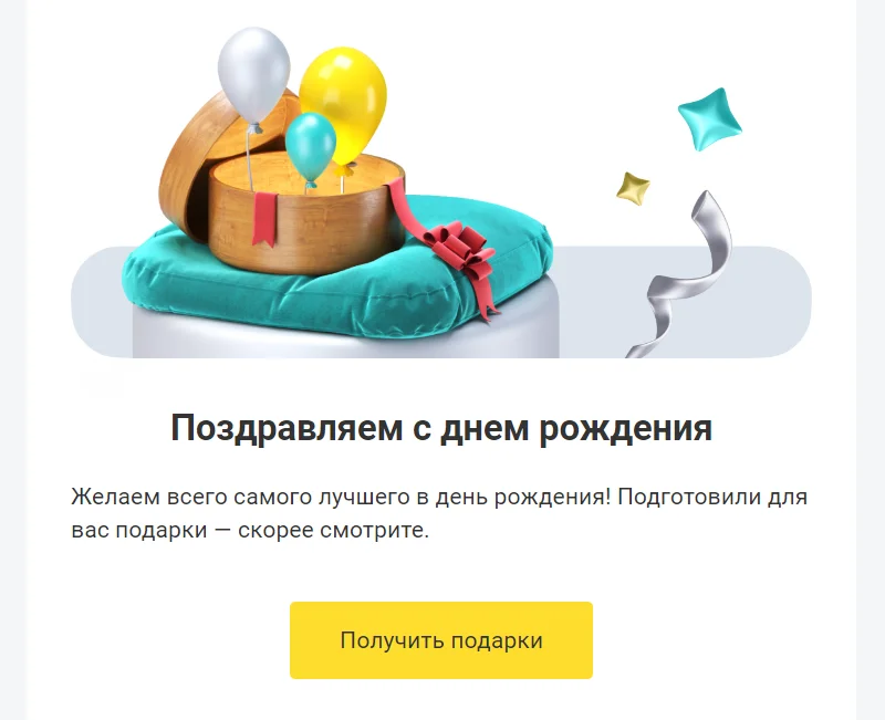 Письма в конкретную дату. Отправляются при наступлении определенной даты, связанной с пользователем — дня его рождения или годовщины обращения в компанию. Задача таких писем — поздравить подписчика, укрепить лояльность, предложить скидку или какой-то другой подарок.