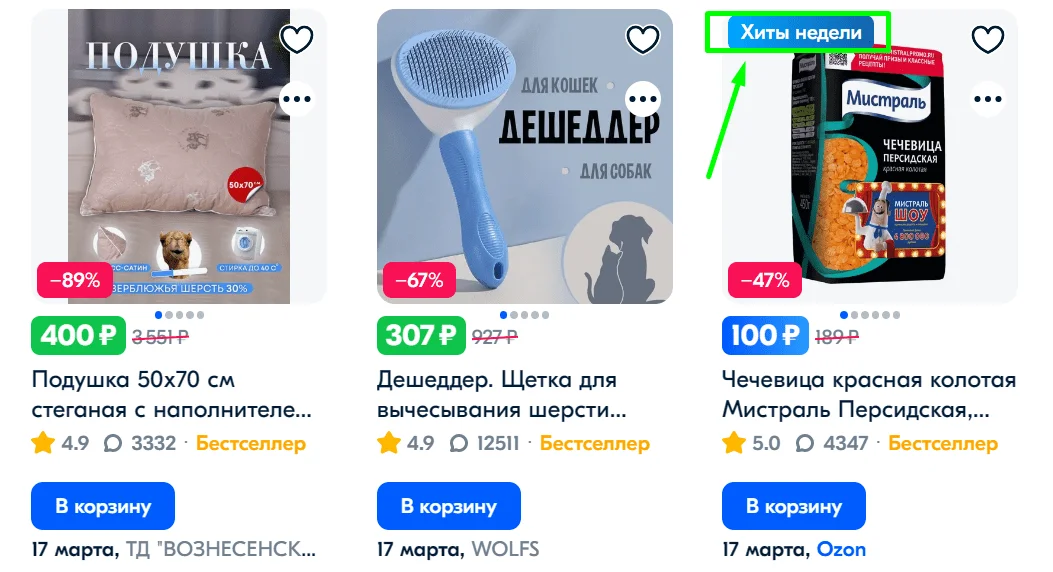 Например, надпись на товаре «Хит недели» притягивает взгляд больше, чем похожие продукты без такой же пометки.