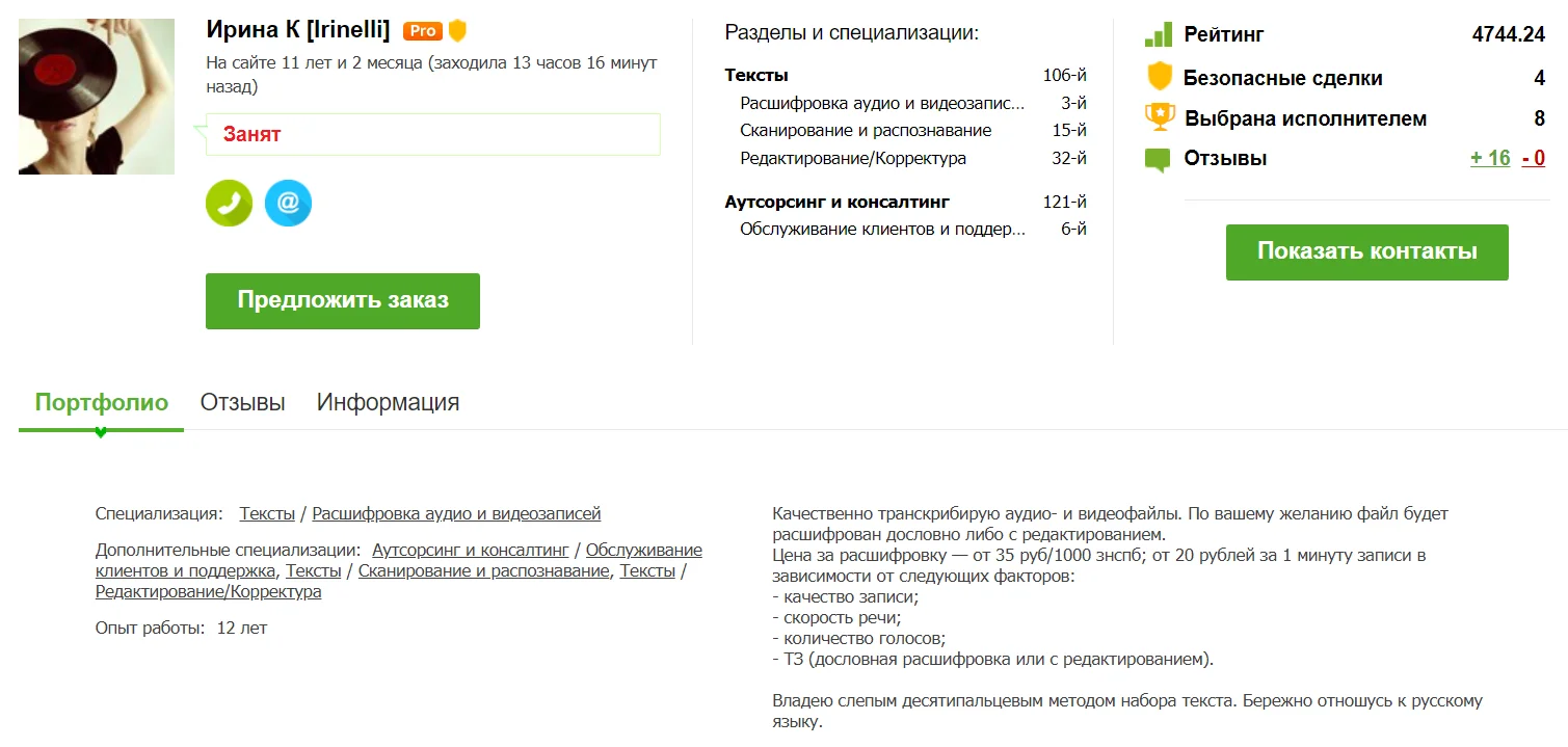 Чем занимается. Расшифровывает аудио или видео материалы в текст. Делает два вида расшифровки: дословную (с паузами, словами-паразитами, иногда с хронометражем) и с редакторской правкой (без слов-паразитов, повторов, лишних звуков). Часто встречаются задачи по составлению субтитров, где в специальной программе нужно записать текстом все, что вы слышите в ролике или фильме.