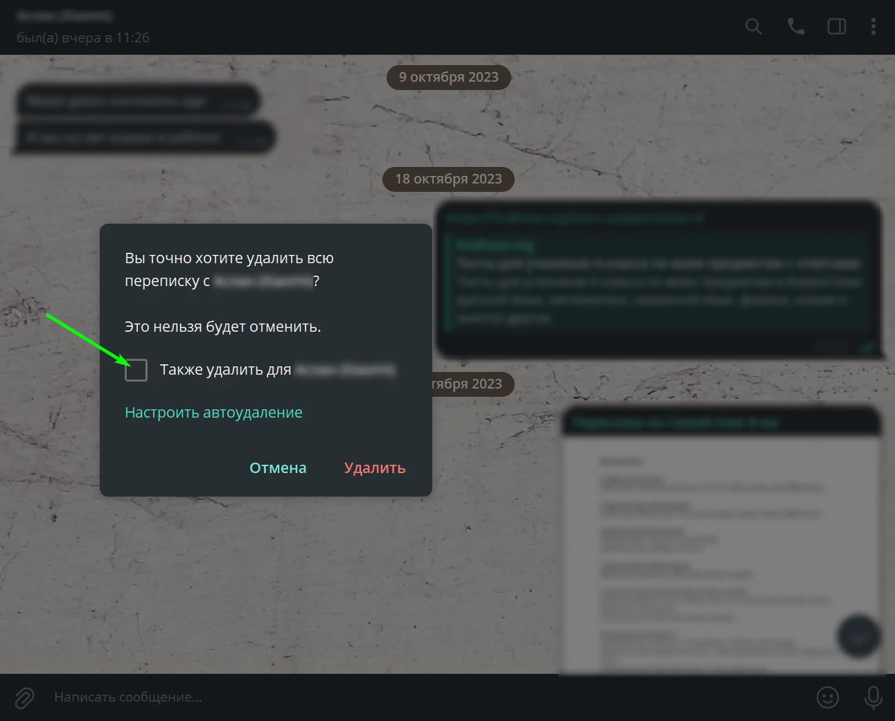 В открывшемся окошке система предложит подтвердить действие. Здесь же присутствует уведомление о том, что после подтверждения отменить удаление переписки нельзя. Важно учесть, что если вы проставите галочку в чек-боксе возле надписи «Также удалить для…», то переписка будет безвозвратно стёрта у обоих собеседников.