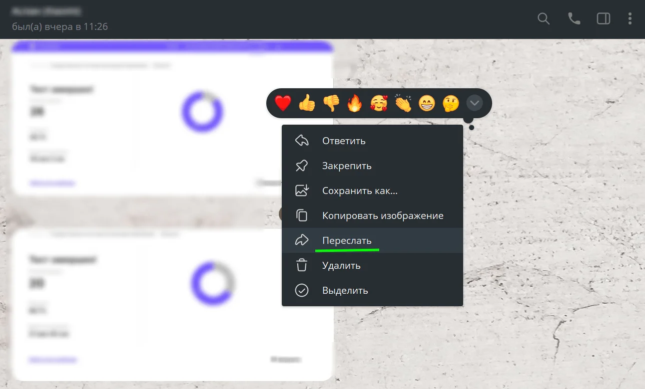 Выберите информацию для сохранения. Для вызова меню нажмите на сообщение вспомогательной кнопкой мыши или тачпада в десктопной версии либо просто кликните по тексту в мобильной версии. В меню выберите пункт «Переслать», а затем в списке чатов — «Избранное».