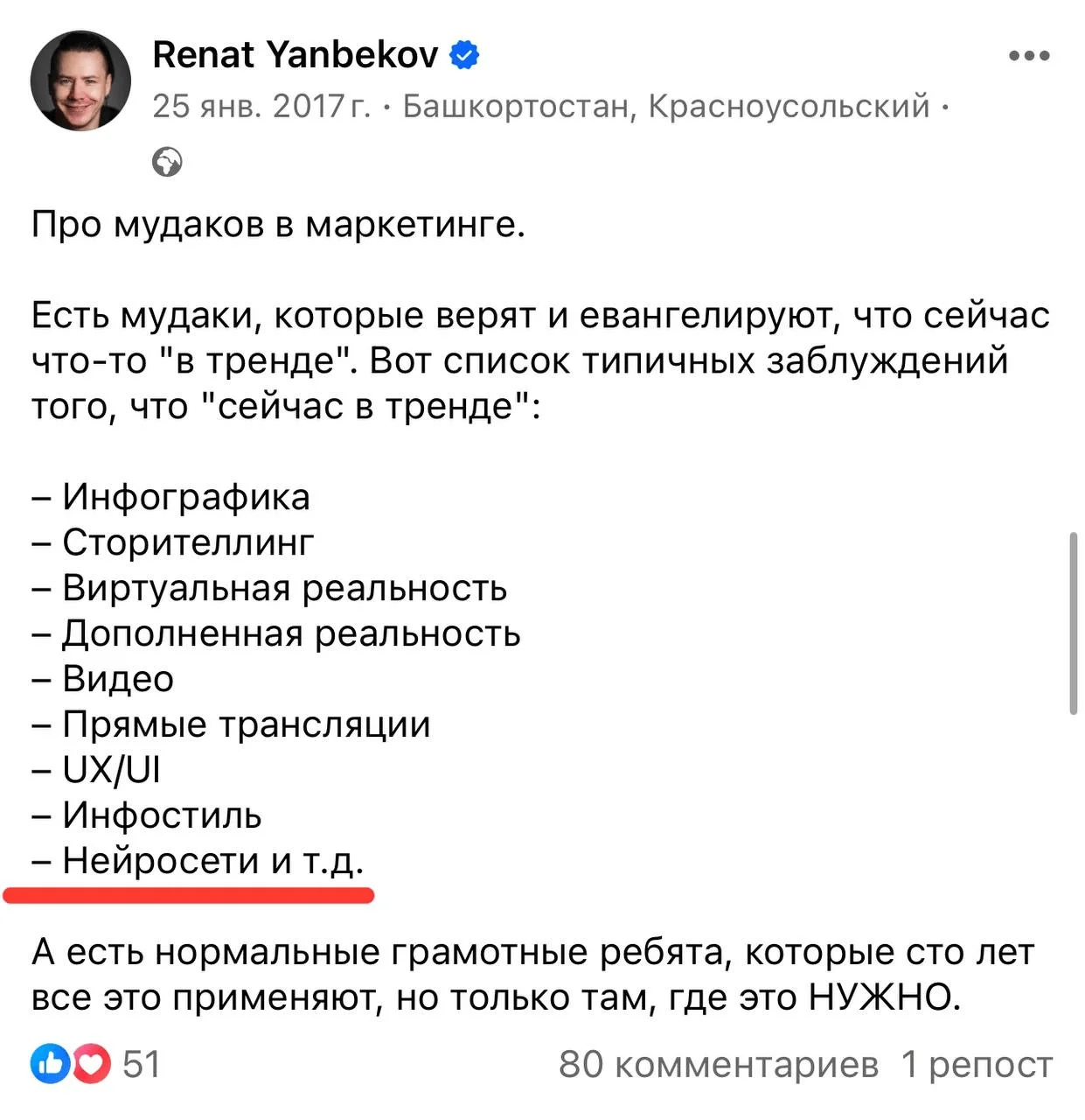 Истерию о том, что надо немедленно бросать все дела и переходить на нейросети, раздувают в основном владельцы курсов по нейросетям. Особенно сильно меня смешит тезис о том, что «надо как можно быстрее освоить нейросети, а то потом будет поздно». Иначе как манипуляцию в целях продажи курса я такой тезис воспринимать не могу.
