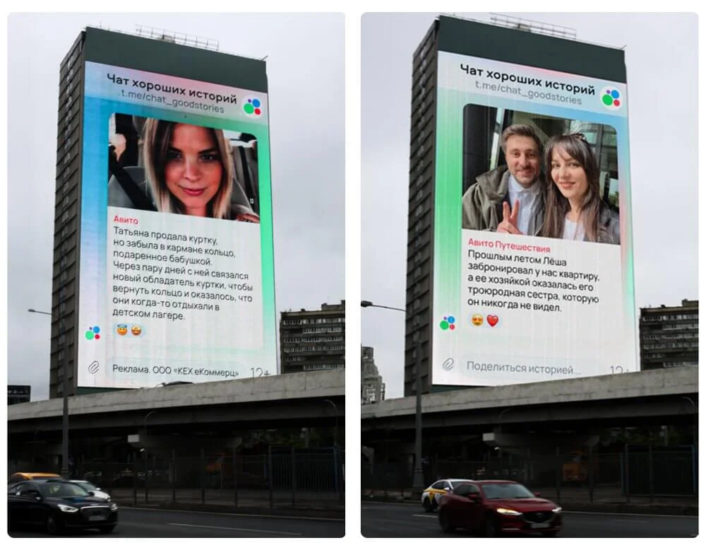 Так, Avito предложил крупным брендам делиться в «Чате хороших историй» добрыми ситуациями, как кому-то помог их продукт. История получила отклик у пользователей — те начали присылать свои рассказы, а самые интересные компания затем использовала в рекламе. Например, компания сделала баннеры о том, как кто-то через посуточную аренду сервиса нашел дальних родственников и вернул фамильную драгоценность.