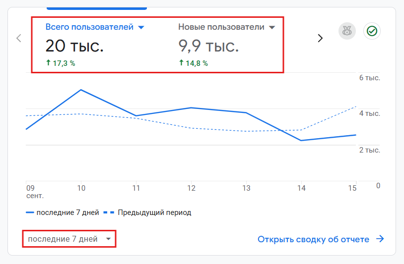 В Google Analytics 4 уникальные посетители называются пользователями. На главной тоже есть дашборд, в котором вы найдете статистику уникальных посетителей сайта. Под графиком настраивают период отображения статистики.