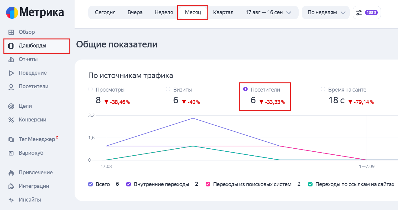 В Яндекс Метрике на главной странице есть дашборд, в котором отображается количество посетителей на сайте.