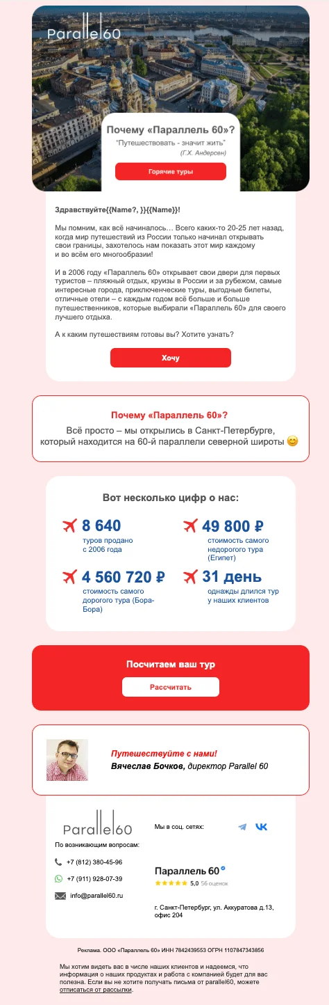 К нам обратилась туристическая компания Parallel 60. Раньше у клиента была рассылка, но на некоторое время ее приостановили. Чтобы ее возобновить и не ухудшить репутацию домена у почтовых сервисов, мы предложили сделать прогрев, а затем перейти к регулярным рассылкам.