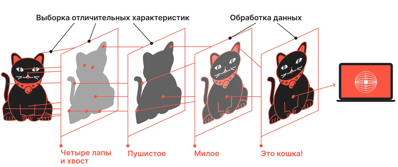 Глубокое обучение — вид машинного обучения, в котором нет пошаговых команд. Алгоритмы на основе загруженных данных сами учатся выявлять закономерности и находить общие характеристики. Самый распространённый и известный способ глубокого обучения — это нейросети. Они учатся на примерах, как дети: запоминают образы и отличительные черты предметов.
