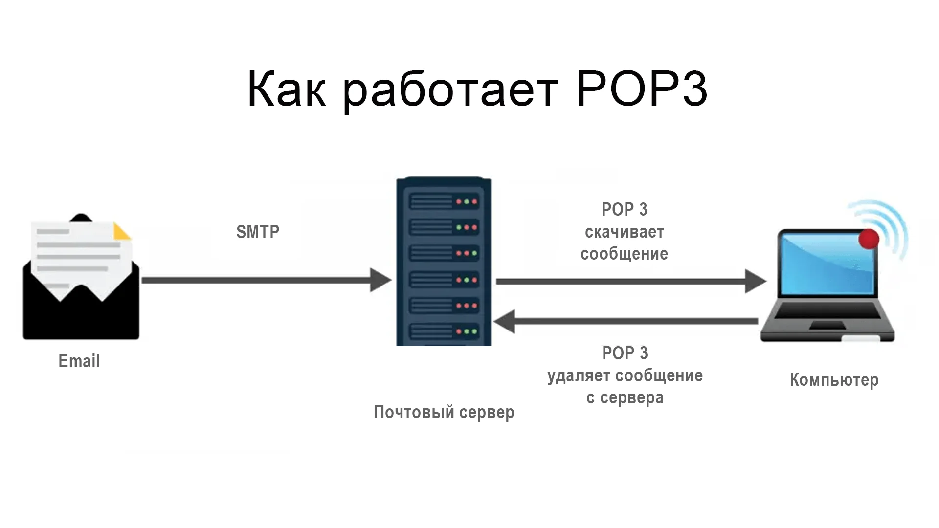 Есть три основных протокола: SMTP, POP3 и IMAP. Первый отвечает только за отправку писем с почтового клиента на сервер и используется для массовых рассылок. POP3 и IMAP управляют тем, как письма доставляются и хранятся на устройствах получателей. От них зависит в том числе и то, как пользователь будет взаимодействовать с письмом, поэтому в статье мы рассматриваем именно их.