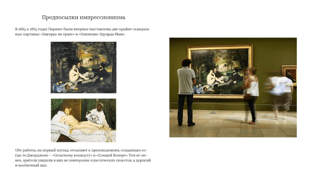 Вот еще пример. В книге об искусстве картина «Завтрак на траве» Эдуарда Мане — иллюстрация к параграфу об импрессионизме. Но в парижском музее «Орсе» — это уже самостоятельное произведение искусства.