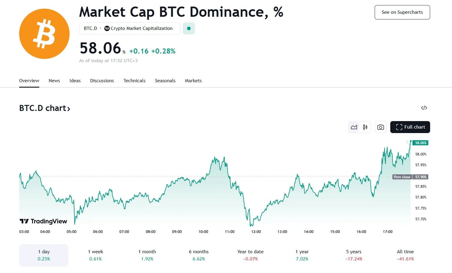 В январе 2025 года биткоин занимает 58% от общей рыночной капитализации криптовалют. Это примерно $1,8 трлн.
