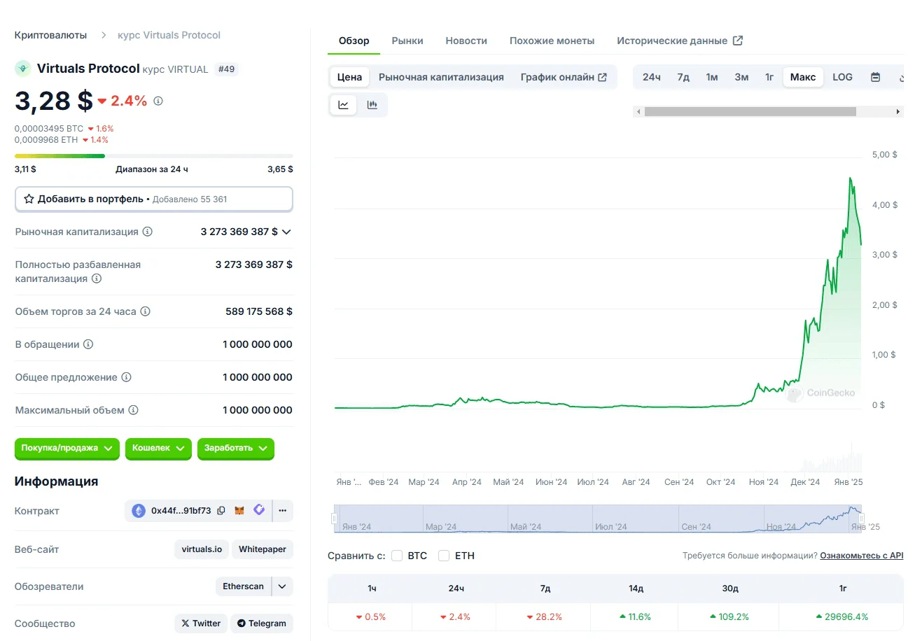 Под конец 2024 года — начало 2025 в криптовалюте появилось много платформ для запуска таких агентов. Одна из самых популярных — платформа Virtuals. С октября 2024 по январь 2025 года стоимость их токена Virtual (который нужен для запуска ИИ-агентов) выросла на 29 000%.