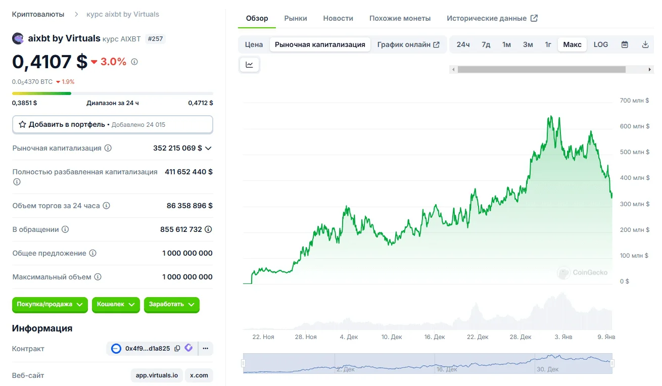 За месяц капитализация токена агента выросла до $350 млн, а в пике доходила до $650 млн. Стоимость токена также росла от 0 до $0,65.