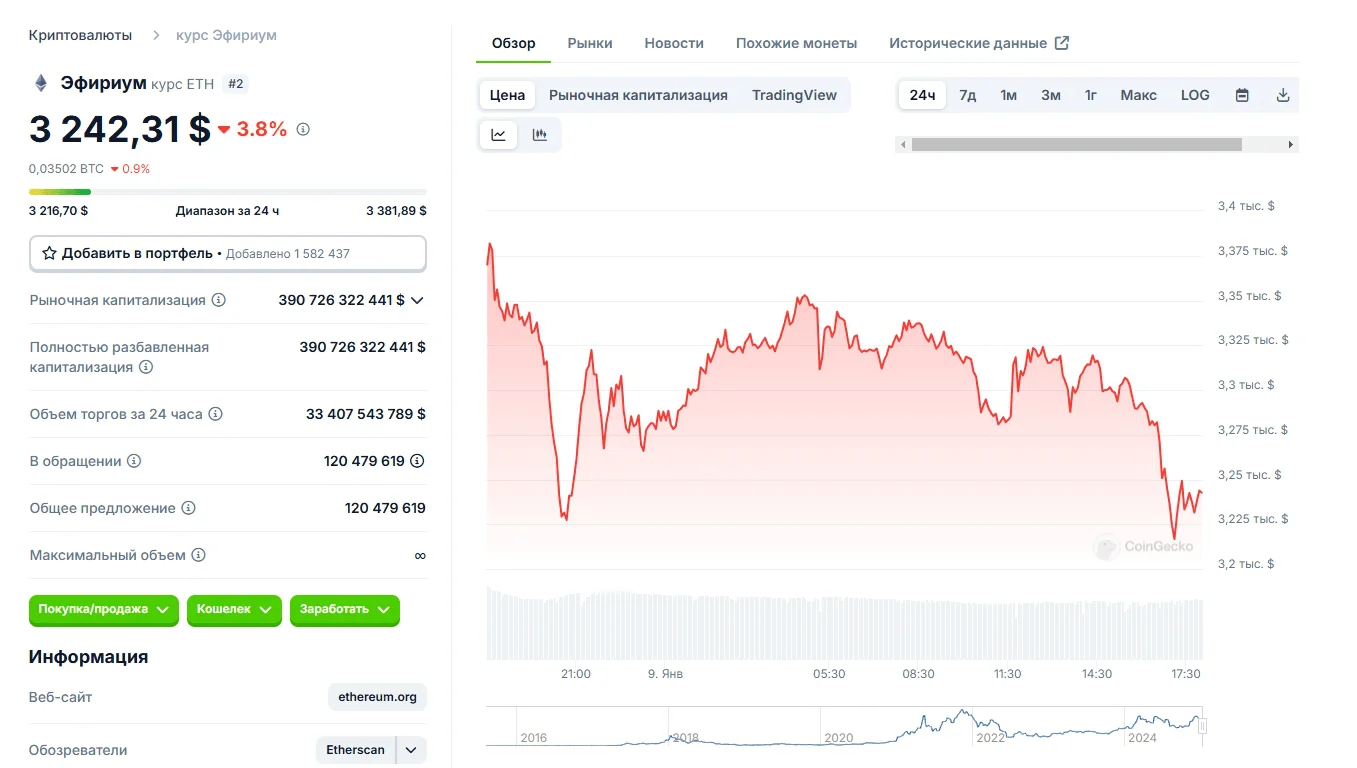 Ethereum (ETH) — вторая по величине и популярности криптовалюта. В январе 2025 года его капитализация составляет $390 млрд.