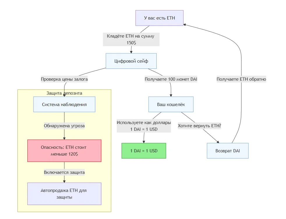 Работает это по принципу усовершенствованного ломбарда: вы кладёте ETH на сумму $150 и получаете 100 DAI, которые можете использовать в любых целях. Когда вы возвращаете 100 DAI, ваши ETH возвращаются к вам в полном объеме.