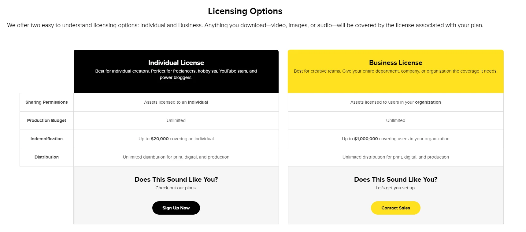 Как правило, платные стоки предлагают два типа лицензии: «Стандартную», которая соответствует Royalty-Free, и «Расширенную» — по принципам Extended Royalty-Free. Бывает ещё разделение тарифов на «Индивидуальный» и «Бизнес» — если контентом будет пользоваться не один человек, а целая компания.