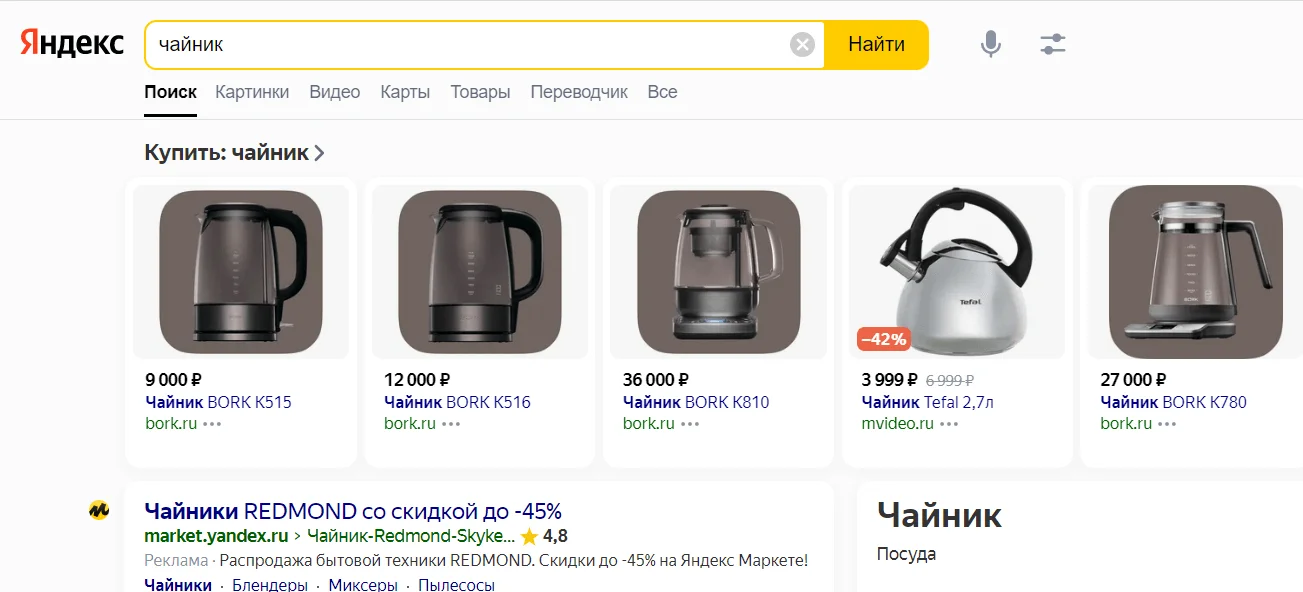 Стандартные динамические объявления отображаются в поиске Яндекса так же, как и ТГО, но текст объявления меняется в зависимости от контекста показа. Например, если рекламодатель рекламирует электрические чайники из своего магазина, он может загрузить фид со всеми моделями, и система сама покажет пользователю именно тот утюг, который он ищет и который есть на сайте рекламодателя.