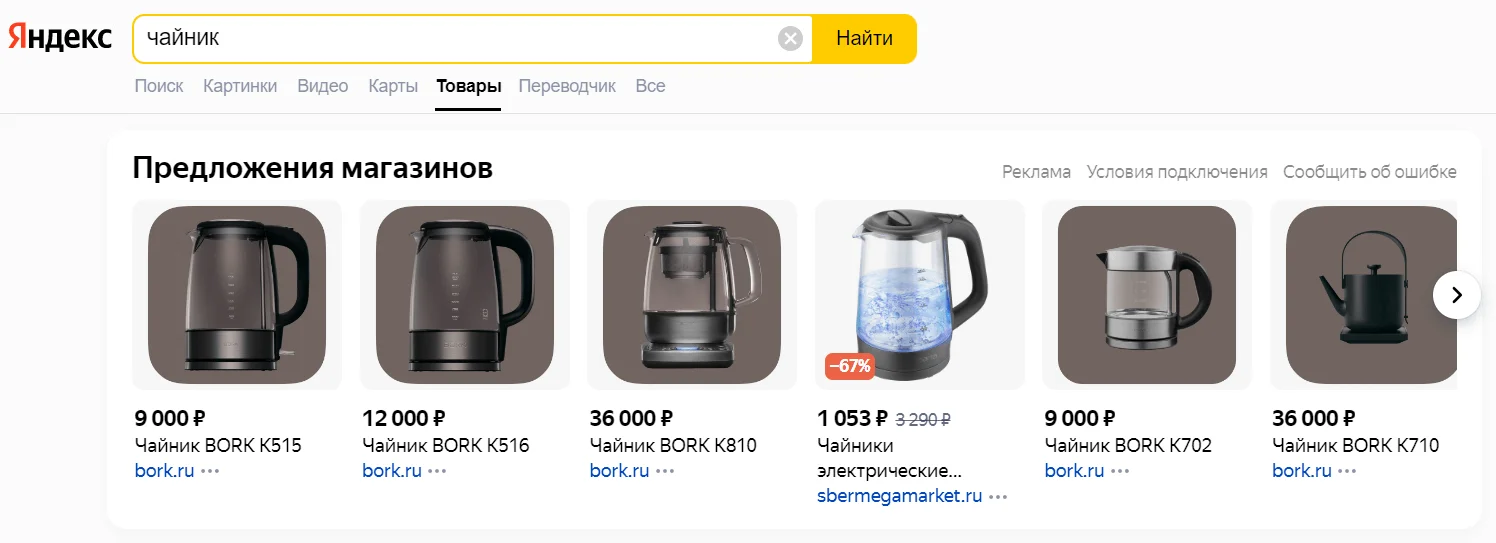 Карточка в поиске по товарам — ещё один формат динамических объявлений. Он отображается в поиске Яндекса по товарам. Если пользователь кликнет по какому-то из товаров, он попадёт прямиком на сайт рекламодателя.