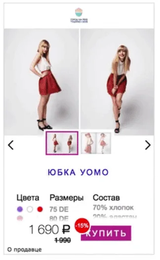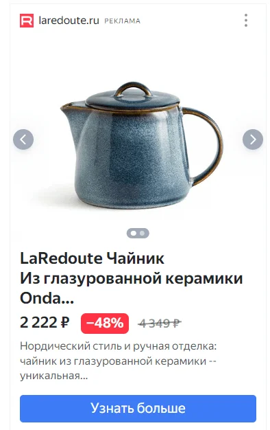 Смарт-баннеры отображаются только в РСЯ и выглядят как карусель изображений — она формируется на основе интересов пользователя, фида товаров или контента сайта. То есть это такой мини-каталог, в котором можно полистать товары магазина и узнать информацию о них, не переходя на сайт магазина.