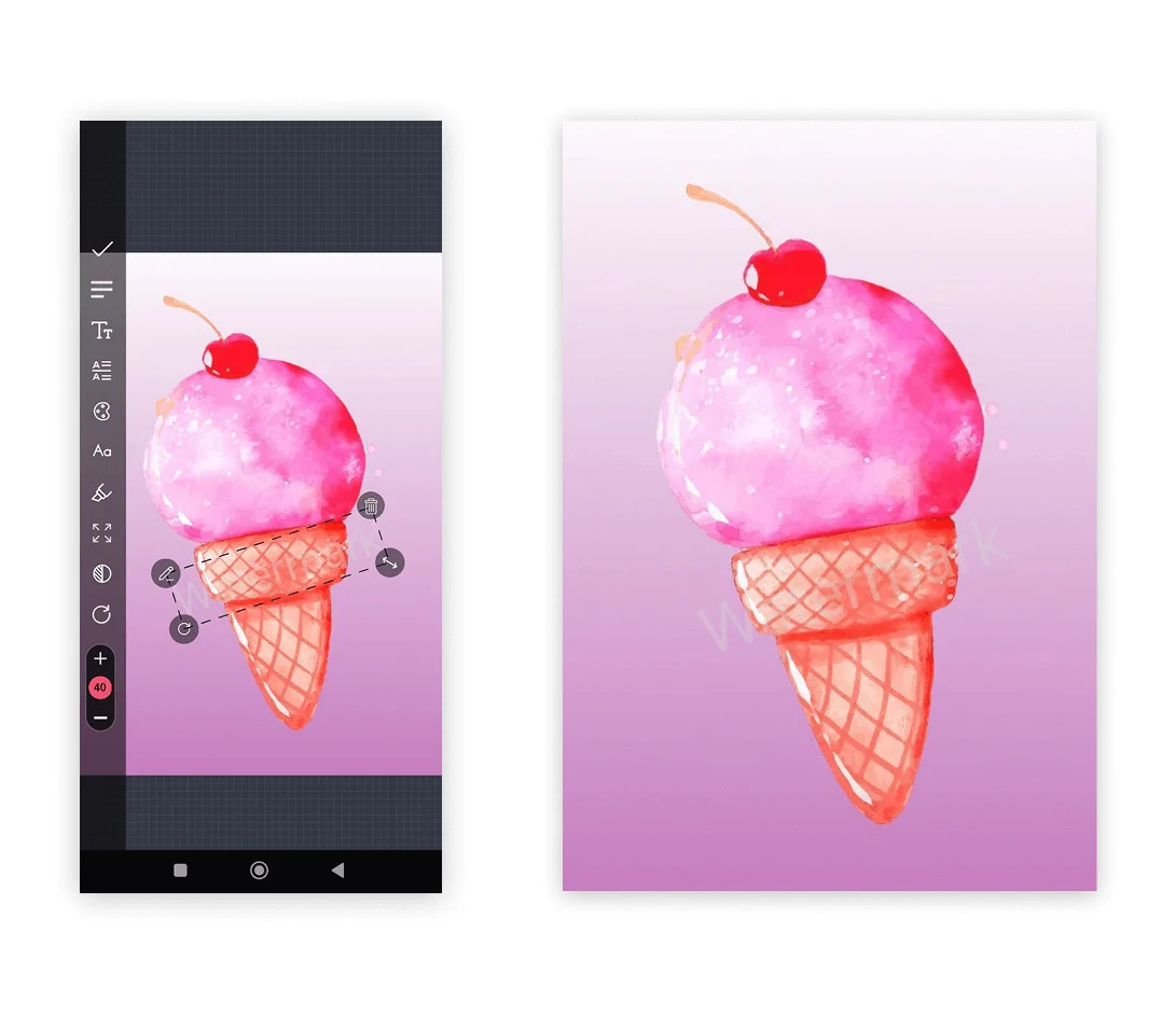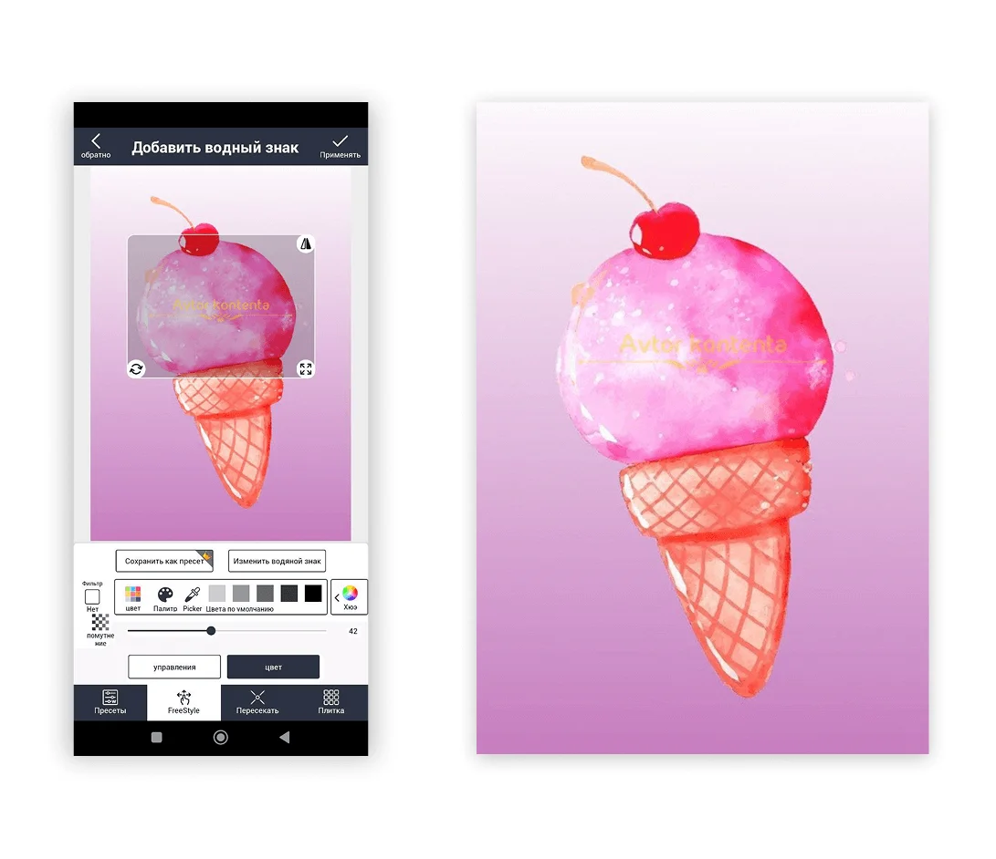 Android-приложение, где можно делать водяной знак для фото из шаблонов или собственных логотипов. Перед добавлением элемент можно отредактировать и выбрать оптимальное размещение. Есть пакетная обработка фото. Некоторые функции платные.