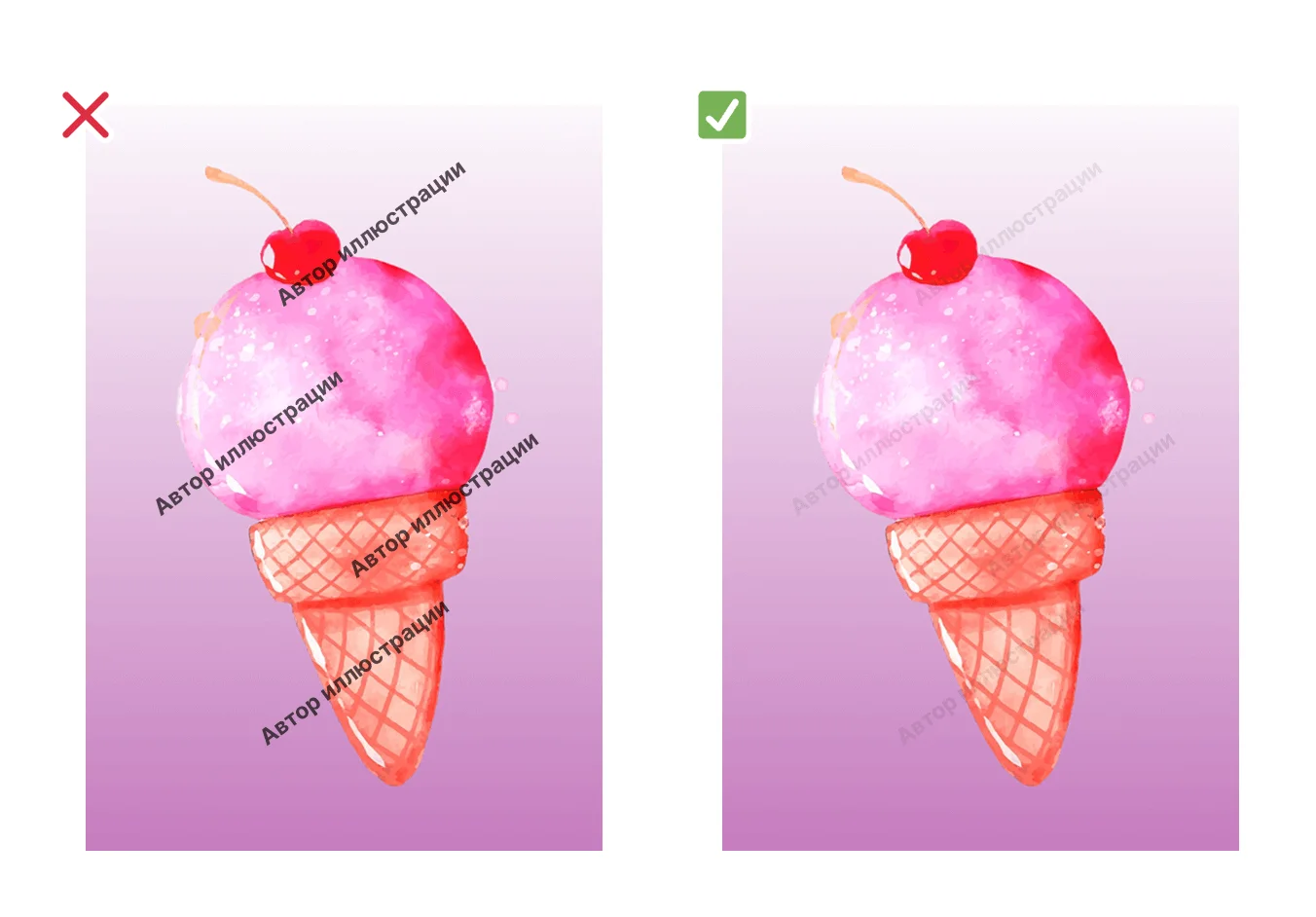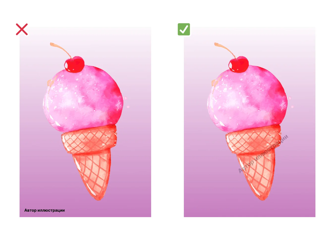 ✖ Недостаточная защита от копипаста. Даже качественно сделанный водяной знак не всегда защищает изображения от воровства. Знак можно обрезать, удалить, закрасить или перекрыть другим элементом.