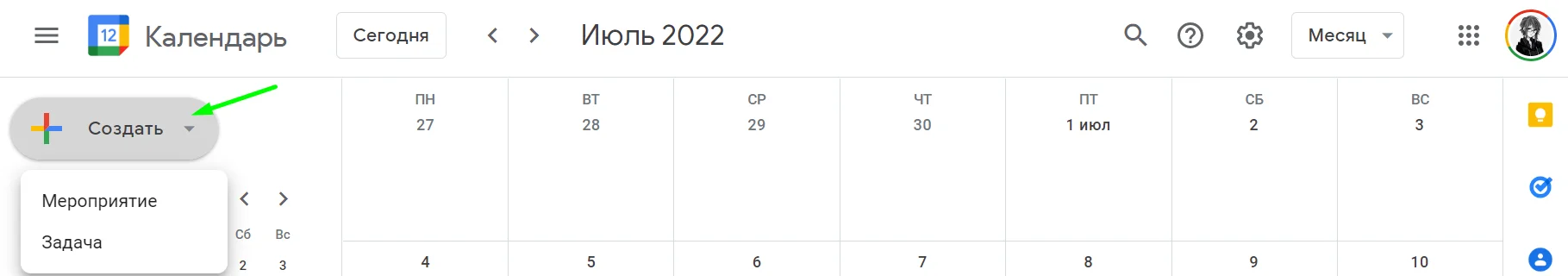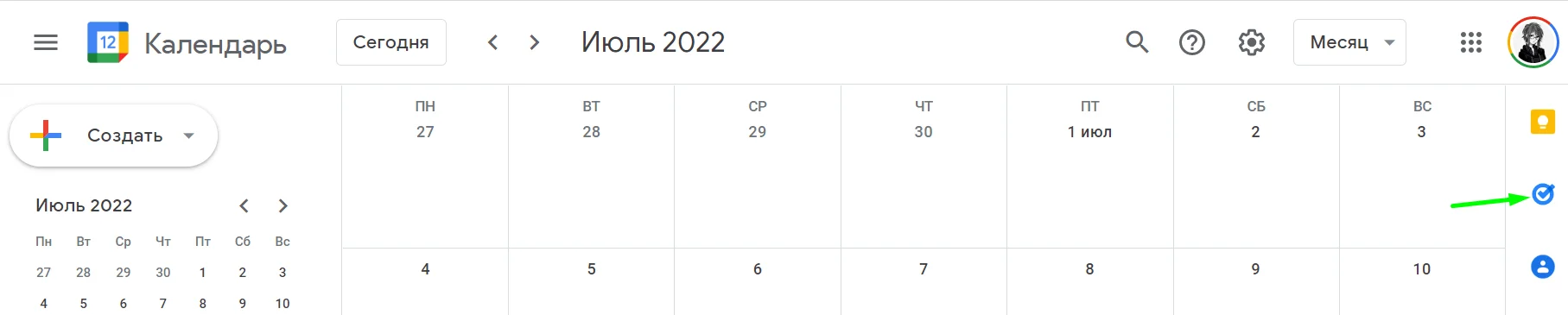 Также перейти в Календарь можно из Gmail, Google Диск, Google Документы. На боковой панели сервисов Google есть значок, клик по которому откроет Календарь.