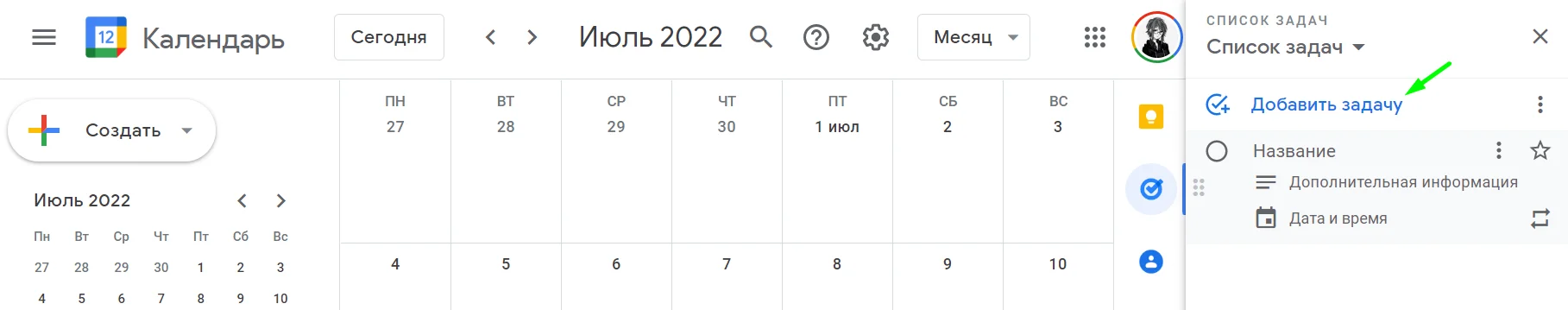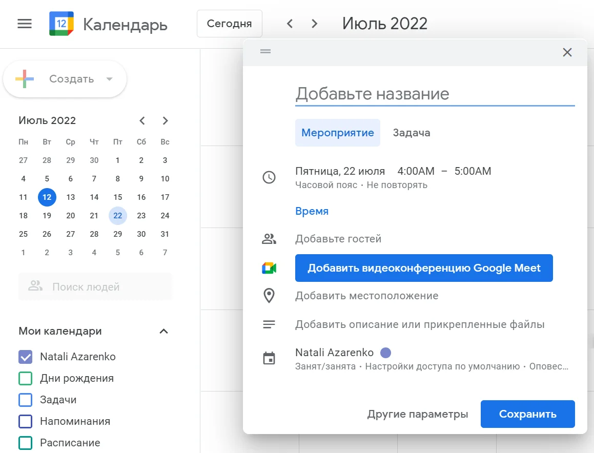 По умолчанию у вас есть только один календарь. Он обозначен вашим именем на левой боковой панели. Если будете использовать Google Calendar для разных целей — например, для личных дел и работы — то все задачи станут отображаться в одной вкладке. Это не очень удобно. В таких случаях вы можете создать новый календарь.
