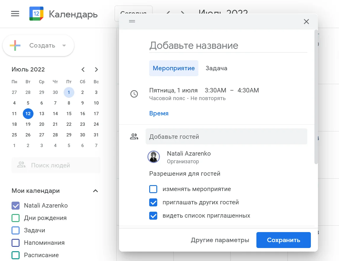 Кликнув на название календаря, вы можете указать параметры доступа — общедоступное (описание видно всем пользователям) или личное (видите только вы) . Также можно настроить напоминание о встрече.