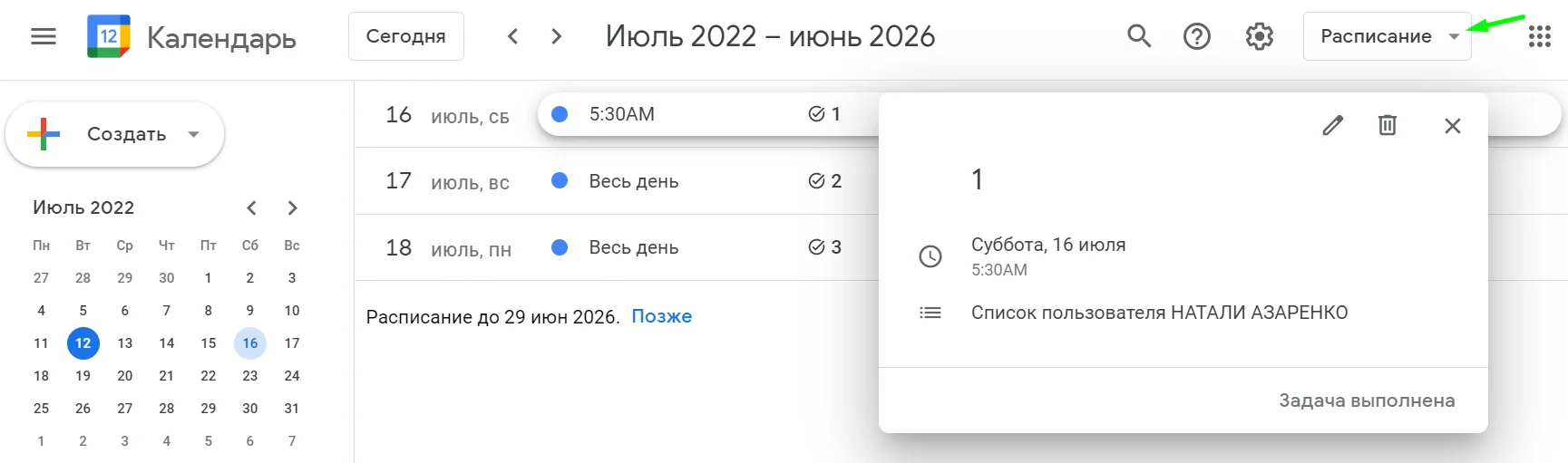 Если в режиме отображения календаря выбрать «Расписание», вы увидите все запланированные события в виде списка. Клик по отдельной задаче откроет карточку с её описанием.