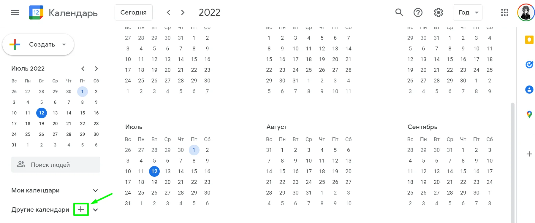 В левой части страницы найдите раздел «Другие календари» и кликните на знак плюса. В появившемся меню выберите «Создать календарь».