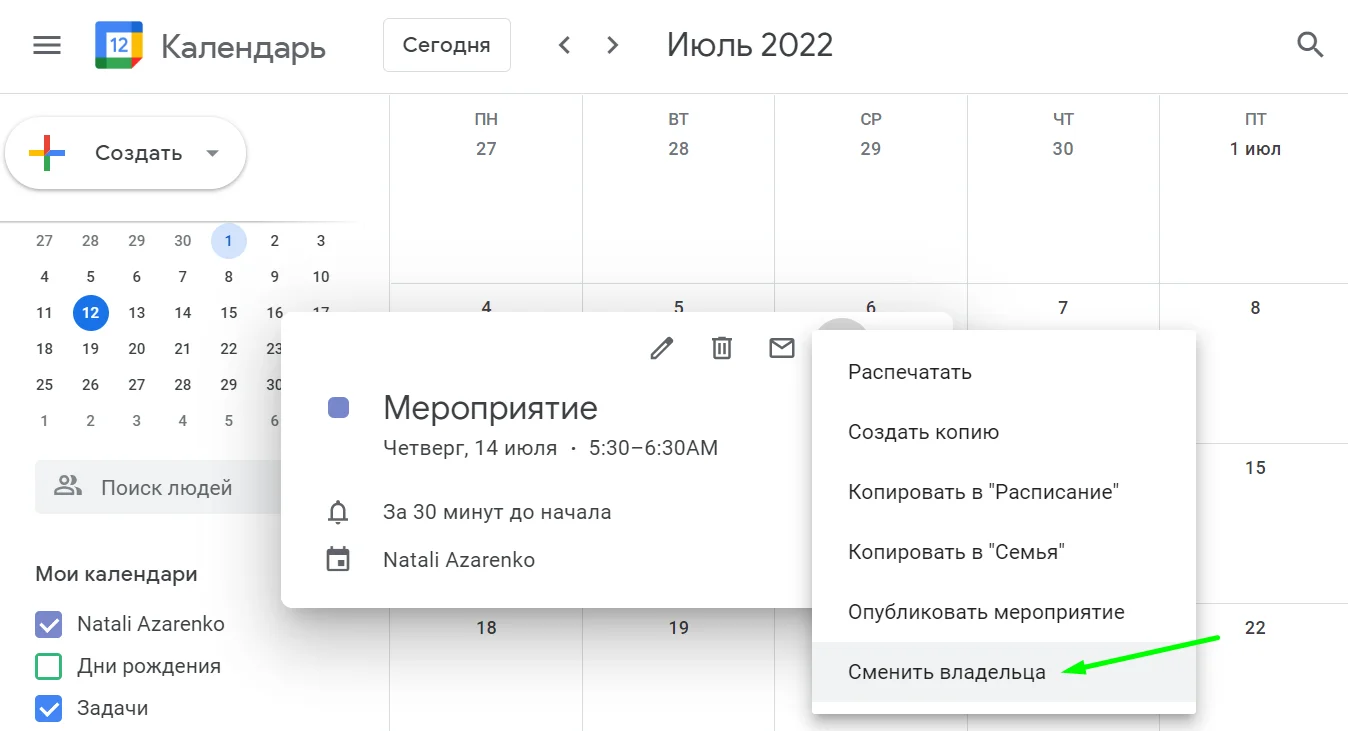 По умолчанию вы становитесь владельцем всех карточек в календаре, которые создали. Но когда речь идёт о мероприятии, вы можете сменить владельца — или организатора — и предоставить ему полный контроль. Для этого откройте карточку и кликните на троеточие в правом верхнем углу. Выберите пункт «Сменить владельца» и укажите email нового организатора. Новый владелец получит уведомление о том, что ему передали права на мероприятие. Текст сообщения можно предварительно отредактировать.