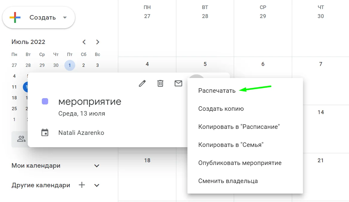 Можно отправить в печать отдельную карточку с мероприятием. Вызовите меню через троеточие в карточке и кликните на «Распечатать».