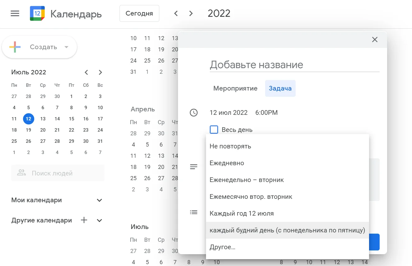 Откройте календарь на год. Начните создавать карточку с задачей, выбрав нужный день и время. В графе с выбором даты по умолчанию стоит отметка «Не повторять». Вы можете настроить свой режим напоминаний: просто кликните на надпись и выберите желаемый вариант. Например, можно настроить ежегодное напоминание в конкретный день.