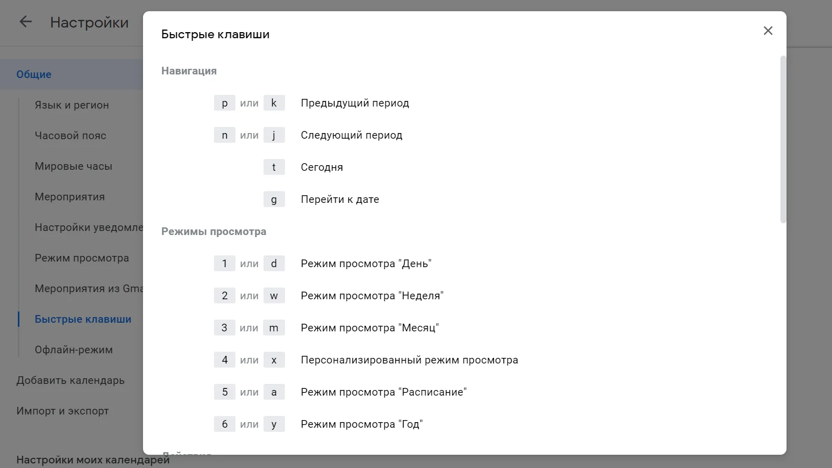 С помощью быстрых клавиш можно упростить работу с Google Календарём. Например, клавиша «T» перенаправит к текущему дню, а клик на «S» откроет настройки.