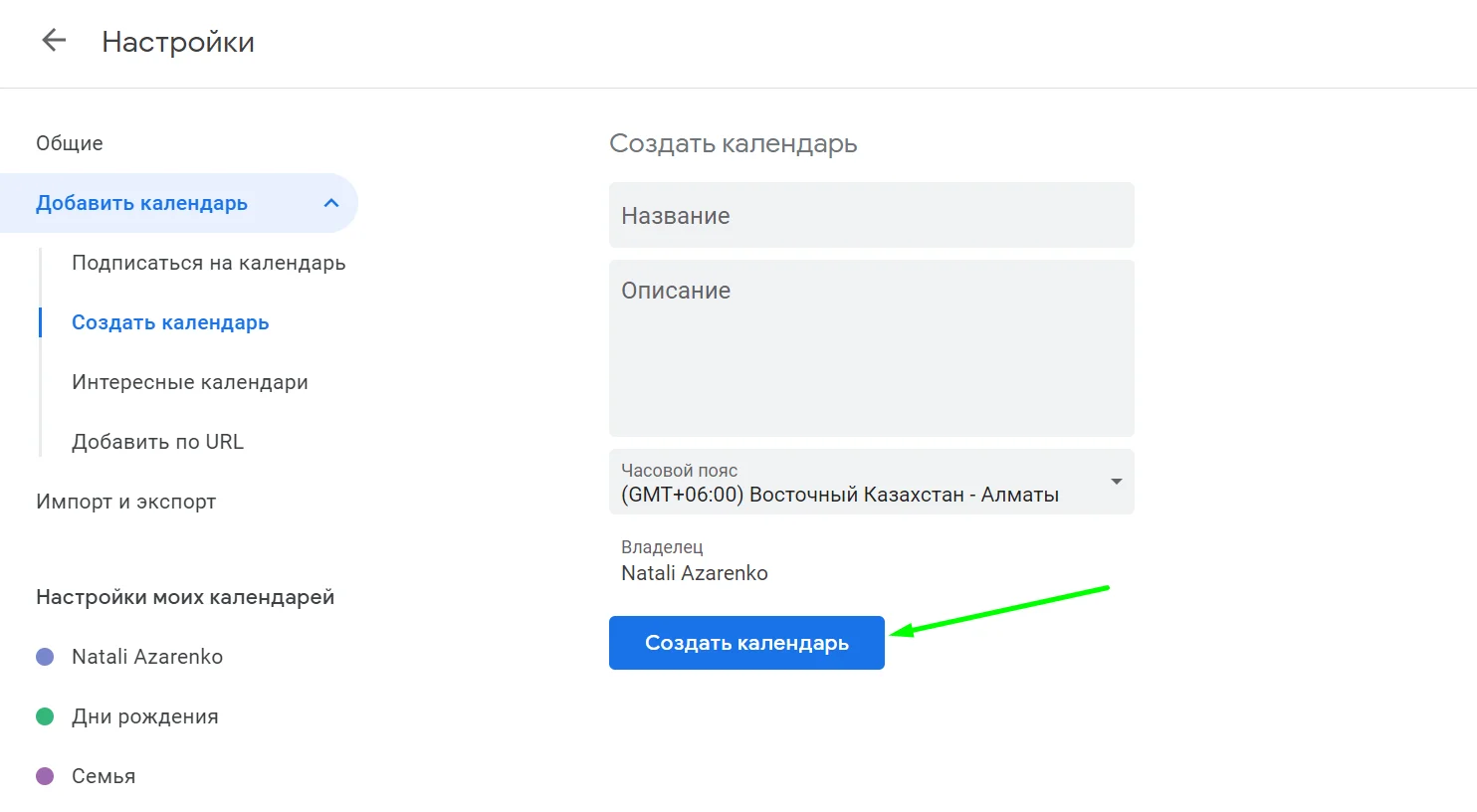 Откроется форма, где можно указать название и описание нового календаря, часовой пояс и владельца.