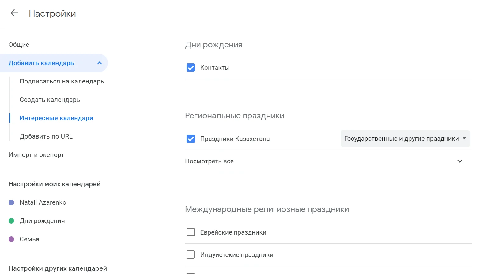С помощью Google Календаря можно отслеживать праздники в разных странах, фазы луны и спортивные события. Для этого кликните на «Добавить календарь», а затем на «Интересные календари».