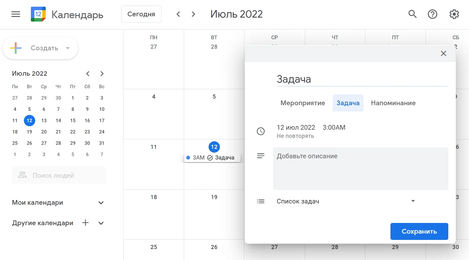 Способ 2. Кликните на нужную дату в календаре — откроется день с почасовым расписанием. Выберите время, в открывшемся окошке укажите характеристики задачи и сохраните карточку.