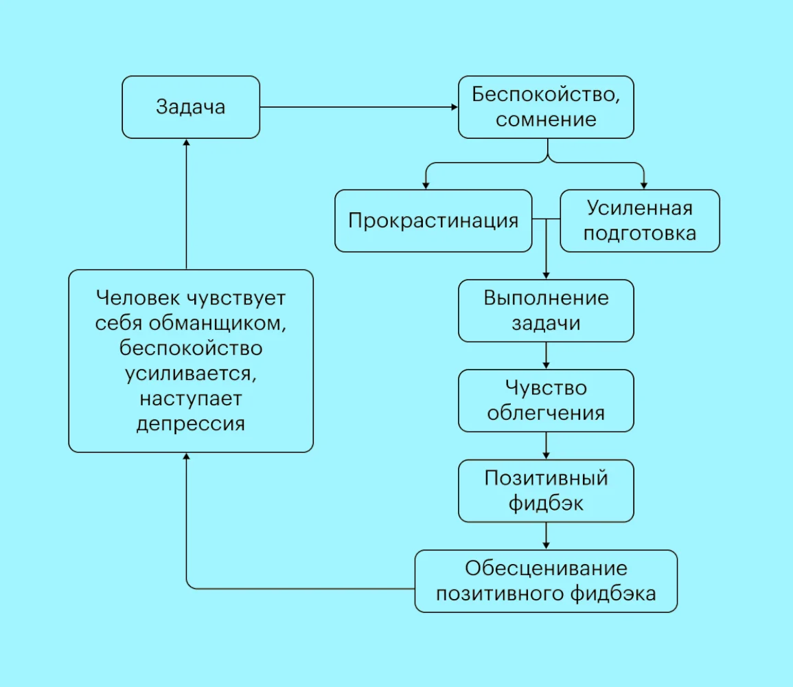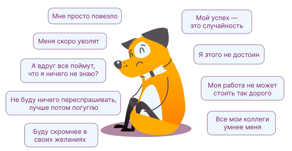 Синдром самозванца — состояние, при котором человек обесценивает себя. Он считает, что у него недостаточно знаний и умений, что он не справится со своими обязанностями. «Самозванец» объясняет любой свой успех стечением обстоятельств и боится «разоблачения».