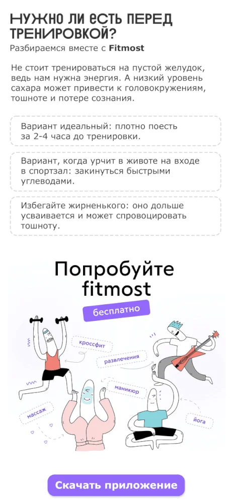 Затем идет рекламный блок. Видимо, все письмо — это одна большая нативка, и тема про спорт и здоровье появилась неспроста, а чтобы прорекламировать сервис Fitmost. Хотя я по ссылке не перешла и приложение не скачала, сама интеграция показалась уместной: не реклама ради рекламы, а польза с призывом к действию.
