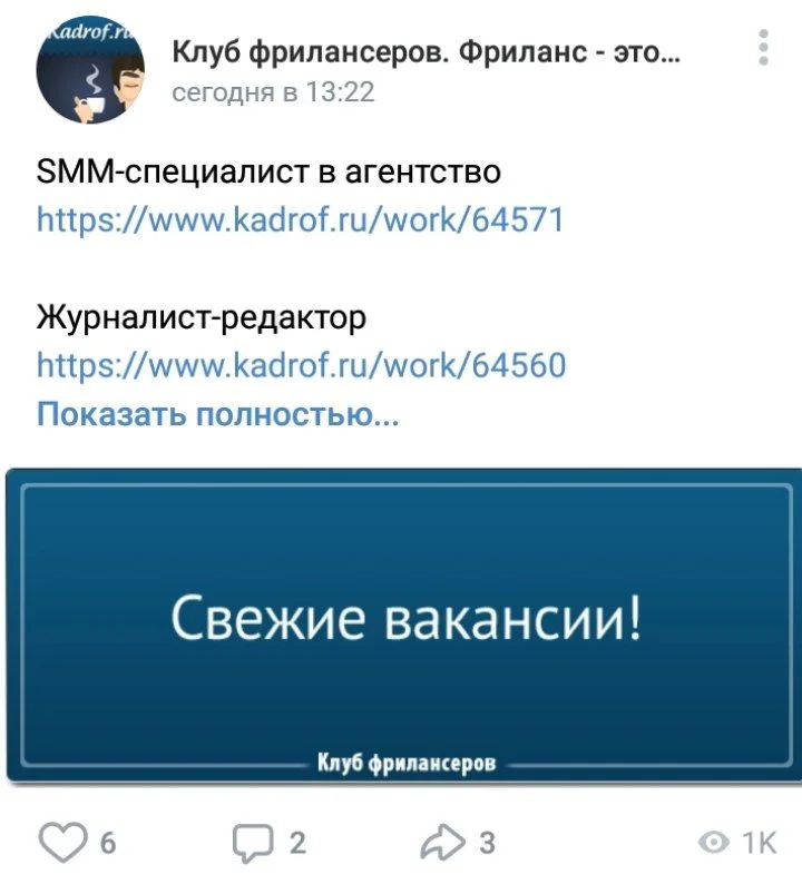 Клуб фрилансеров (135K). Это группа больше похожа на блог: в постах есть опросы, вопросы от подписчиков, статьи, списки полезных лекций и даже мемы — безобидные и редко. Но все же основной контент — вакансии. Их дублируют с сайта несколько раз в неделю.