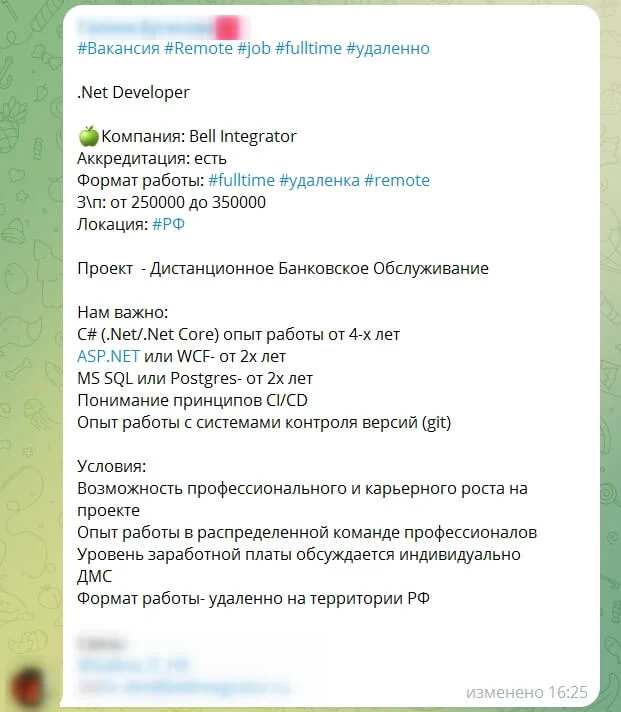 Стоимость публикации — 600 рублей. Но есть пакетные размещения, где стоимость доходит до 2 000 рублей. В них вакансия публикуется на нескольких каналах и за пределами Telegram.