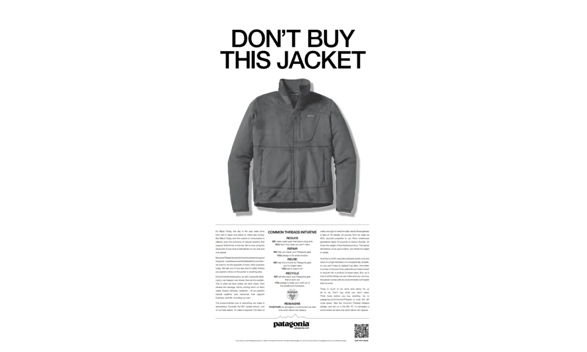 Экологический демаркетинг используют и другие бренды. В 2011 году накануне черной пятницы бренд Patagonia запустил рекламную кампанию «Don’t buy this jacket» (Не покупай эту куртку). Главная цель при этом была не в том, чтобы продавать меньше курток, а в том, чтобы подтолкнуть людей к осознанному потреблению.